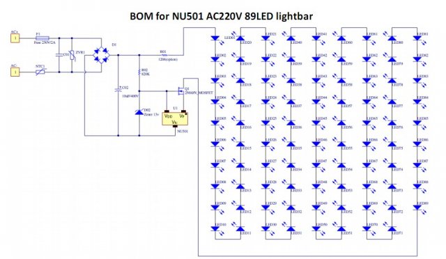 采用NU501这类小IC做的恒流源, NU501的路路恒流实现方式是,需在前级加上一个开关电源,把隔离通过前级来表现出来, 后面再灯板上每路串上小IC进去实现的,我建议最好采用外置式的为好,利于散热,但有时为适应市场需求,只能采用内置的式的了,如果是50V的开关电源,可以做13-15颗LED每串,如果是42V,可以做11-13颗串。36V的可以做,9-11颗/串再低了成本下不去不合算
