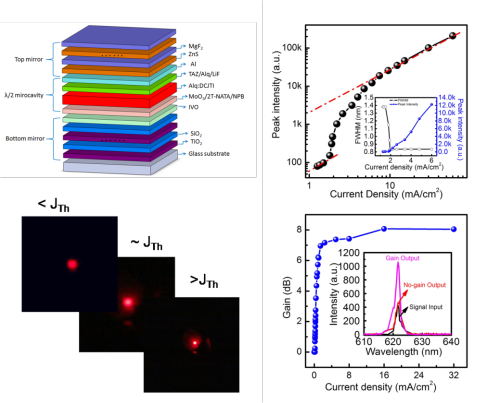 图2.电泵浦有机激光器件的阈值及光放大特性 |